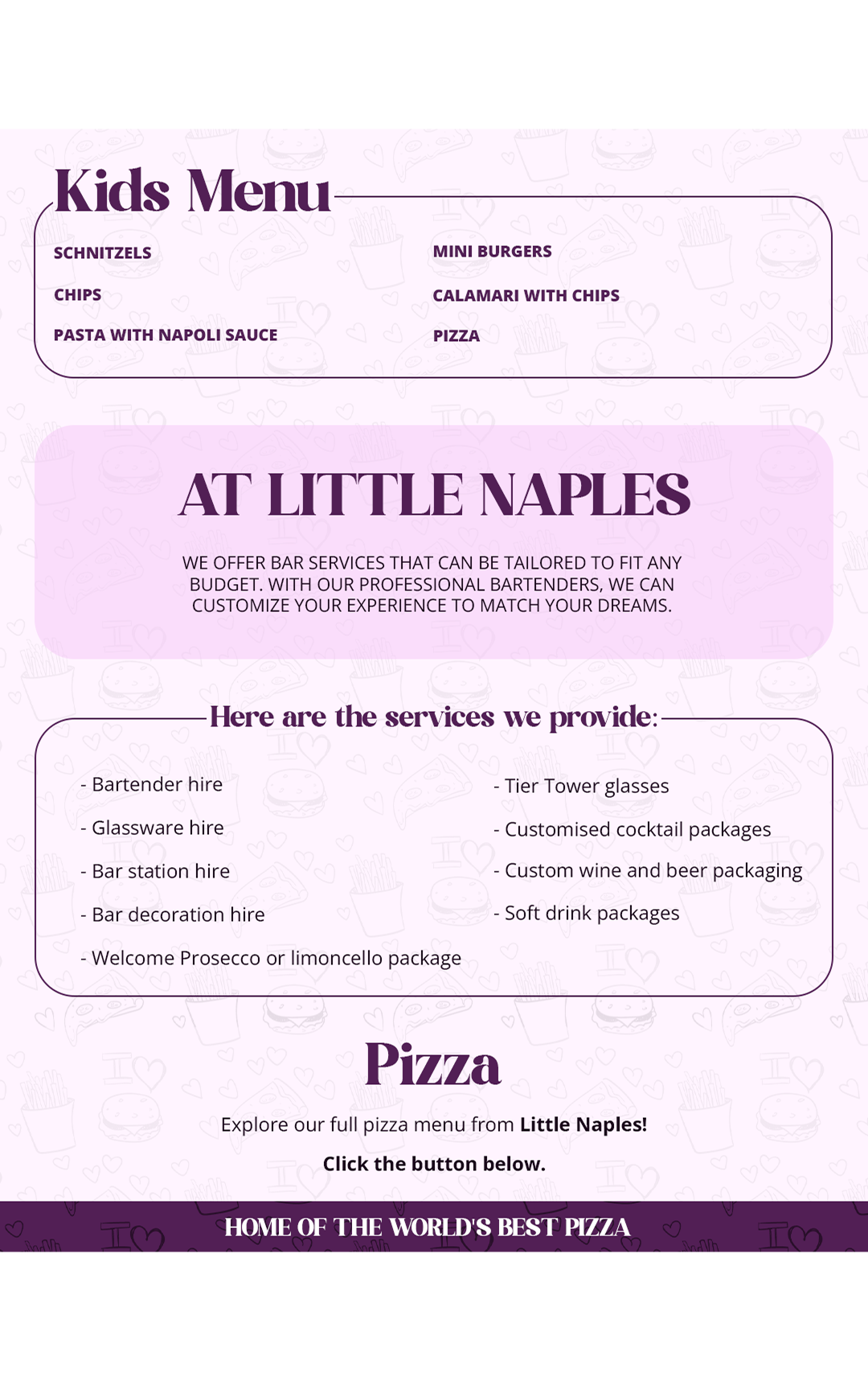 Little Naples Pizzeria cannot guarantee a 100% allergen-free preparation environment. Our products may contain or come into contact with common allergens, including but not limited to fish, shellfish, eggs, milk, tree nuts, sesame seeds, soybeans, wheat, lupin, peanuts, and gluten. These ingredients may be present in our kitchen, and food products may come into contact with allergens during cooking, preparation, and/or serving.